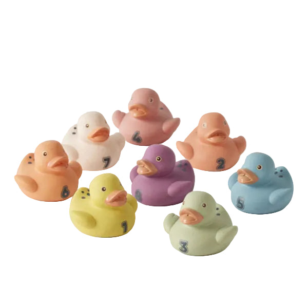 Crafted from sustainable wheat straw and PVC, this delightful set includes eight colourful, numbered ducks designed to make bath time both playful and educational. Ideal for tiny hands, each duck floats effortlessly, supporting early number recognition, sensory exploration, and motor skill development. Designed without holes, these floating bathtime ducks are less likely to harbour bacteria and mould than traditional rubber ducks with holes.